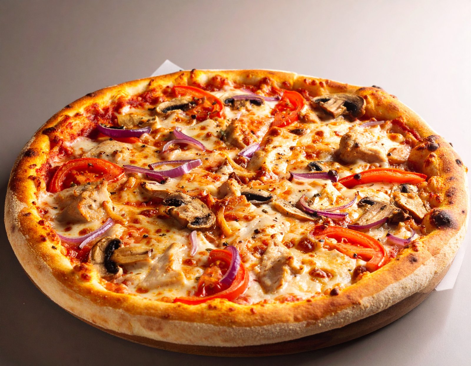 Envie d’une pizza à la fois légère et généreuse ? La pizza chicken est idéale ! Le poulet tendre se marie parfaitement avec les champignons délicats, les poivrons croquants et les oignons légèrement fondants. Le tout est sublimé par une base de sauce tomate relevée et une touche de fromage fondant, reposant sur une pâte artisanale moelleuse, pour une expérience riche en saveurs et en fraîcheur.