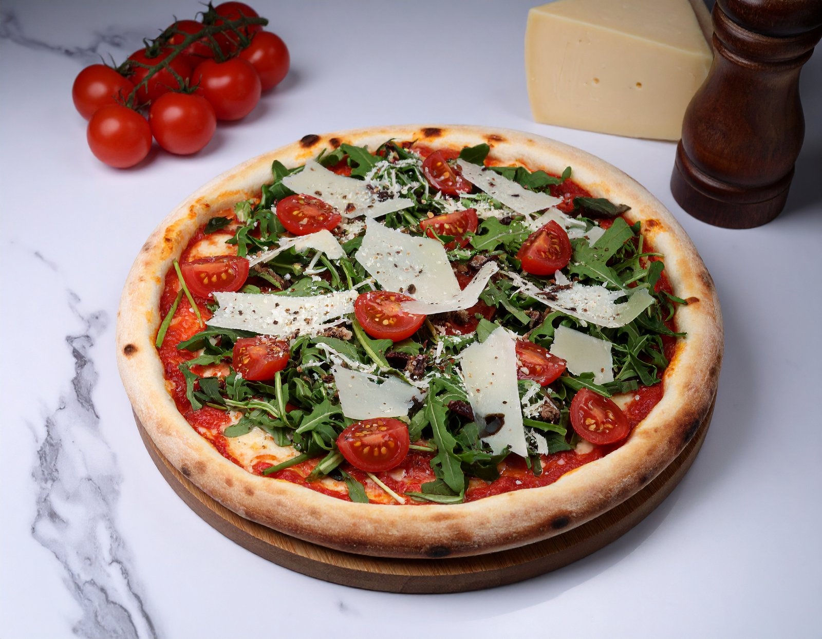 Envie d’une pizza légère et savoureuse ? La pizza roquette est parfaite pour vous ! La crème pesto onctueuse s’allie au fromage fondant, tandis que les tomates cerises apportent une touche juteuse et acidulée. La roquette croquante et le parmesan viennent sublimer l’ensemble pour une expérience gustative raffinée.